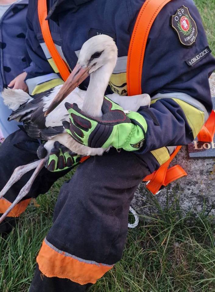 W piątek, 1 sierpnia, do strażaków z Ochotniczej Straży Pożarnej w Łobudzicach wpłynęło zgłoszenie o bocianie, który zaplątał się w linie energetyczne na terenie miejscowości. Szczęśliwie działania na wysokościach zakończyły się odłowieniem ptaka, choc niestety nie obyło się u nieboraka bez kontuzji.