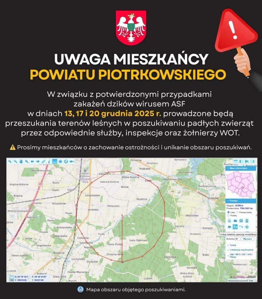 Powiat piotrkowski pozostaje w stanie podwyższonej gotowości w związku z wykryciem kolejnych przypadków afrykańskiego pomoru świń (ASF) u dzików. Służby weterynaryjne, przy wsparciu żołnierzy Wojsk Obrony Terytorialnej oraz innych formacji, prowadzą intensywne przeszukania terenów leśnych i nieużytków. Działania mają charakter ciągły i potrwają co najmniej do 20 grudnia.