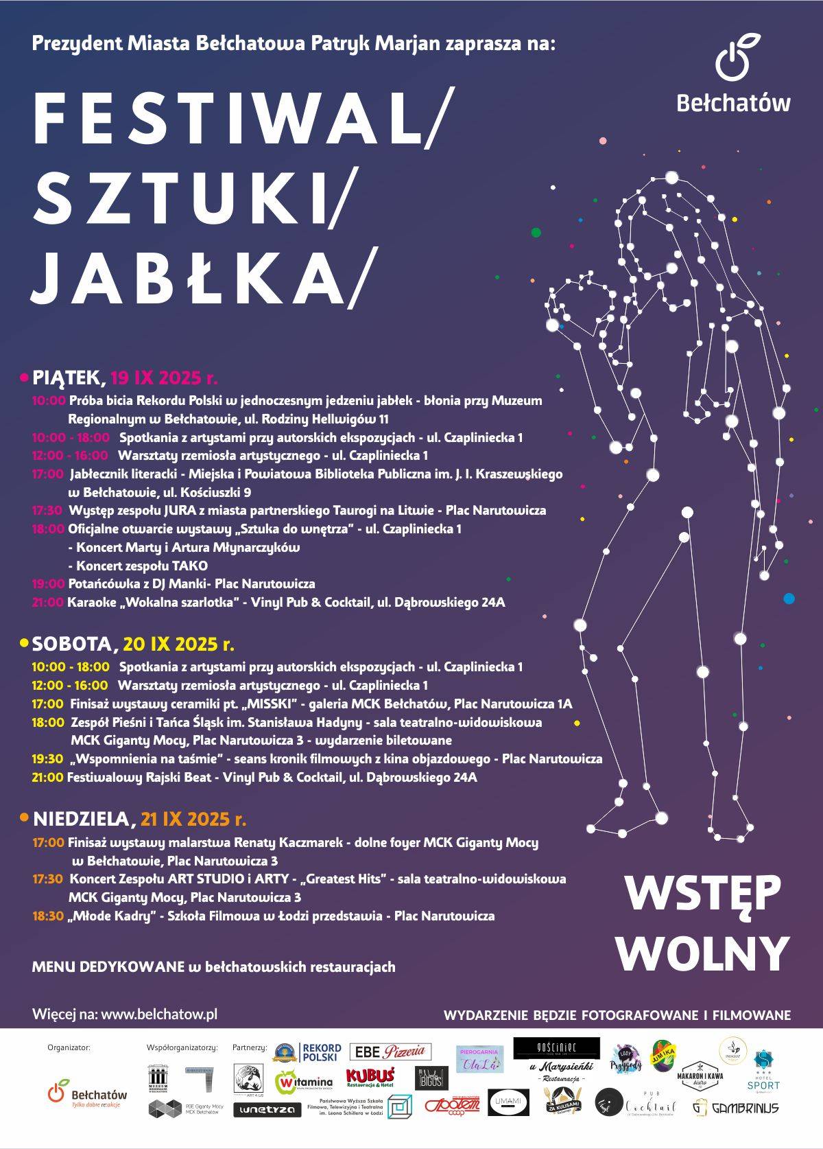 - Będzie soczyście, zdrowo i z wielką energią. Mamy przygotowanych mnóstwo jabłek, liczymy, że wszystkie zostaną zjedzone. Dziękujemy naszym partnerom, którzy zadbali właśnie o to, by tych owoców w piątek nam nie zabrakło- mówi Agnieszka Ludwiczak – Maszewska, wiceprezydent Bełchatowa. - Dlaczego będziemy jeść właśnie jabłka? To symbol naszego miasta, jabłko znajduje się w herbie naszego miasta. Co więcej do niego odnosi się także Festiwalu Sztuki Jabłka, który rozpocznie się już w najbliższy piątek właśnie od próby bicia rekordu. Zapraszamy wszystkich mieszkańców na błonia przy muzeum do kibicowania młodzieży, ale też na wszystkie wydarzenia, jakie odbędą się w ramach wspomnianego Festiwalu Sztuki Jabłka. W programie są warsztaty artystyczne, wernisaż i finisaże, koncerty, pokaz filmów. Będzie też można spróbować specjalnych dań i deserów z jabłkiem w roli głównej. A przygotują je lokalne restauracje - dodaje wiceprezydent Agnieszka Ludwiczak – Maszewska.