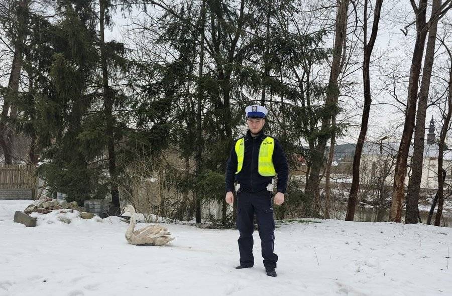 W minioną środę, 10 lutego 2026 roku przed południem policjanci Wydziału Ruchu Drogowego Komendy Powiatowej Policji w Tomaszowie Mazowieckim, pełniący służbę w miejscowości Inowłódz, podjęli nietypową, ale niezwykle ważną interwencję. Funkcjonariusze zostali poinformowani przez przejeżdżającego mężczyznę, że na moście na drodze krajowej numer 48, nad rzeką Pilicą, znajduje się młody łabędź, który zakleszczył się pomiędzy elementami konstrukcji mostu.
