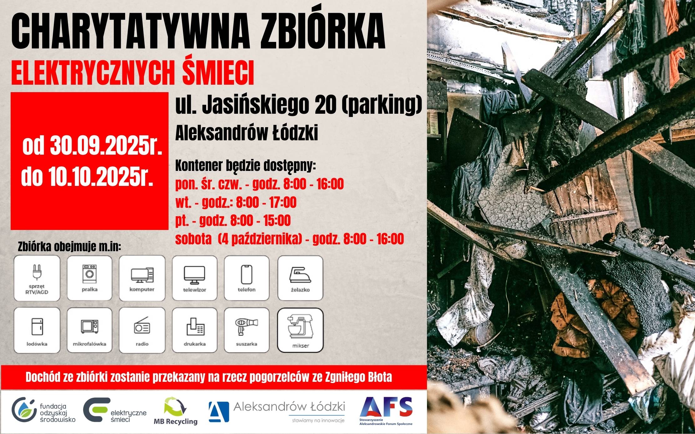 30 września w Aleksandrowie Łódzkim rozpocznie się charytatywna zbiórka elektrycznych śmieci na rzecz rodziny pogorzelców ze Zgniłego Błota. Wystarczy oddać starą pralkę, lodówkę albo piekarnik – każdy kilogram zamieniony zostanie na środki finansowe dla poszkodowanych w pożarze.