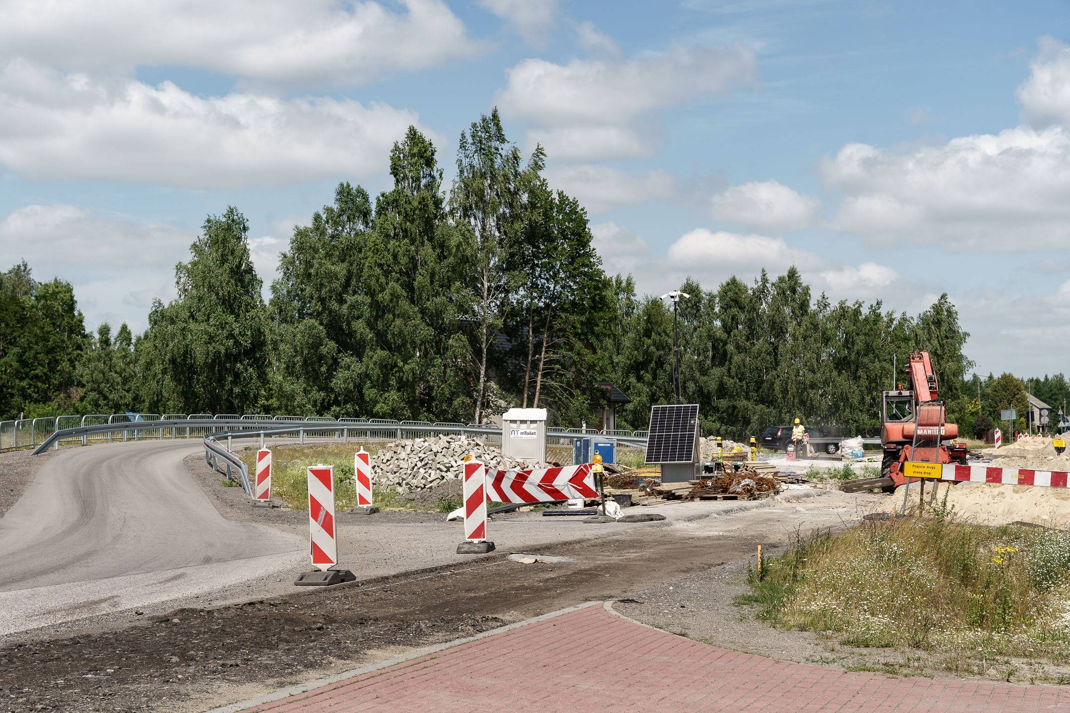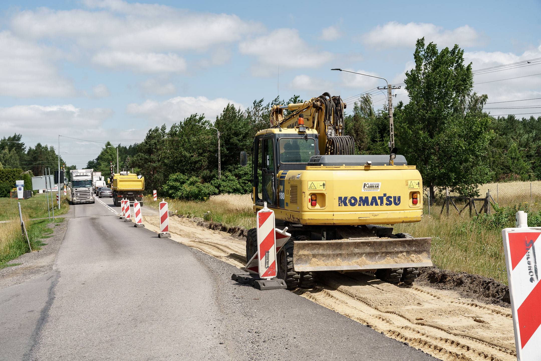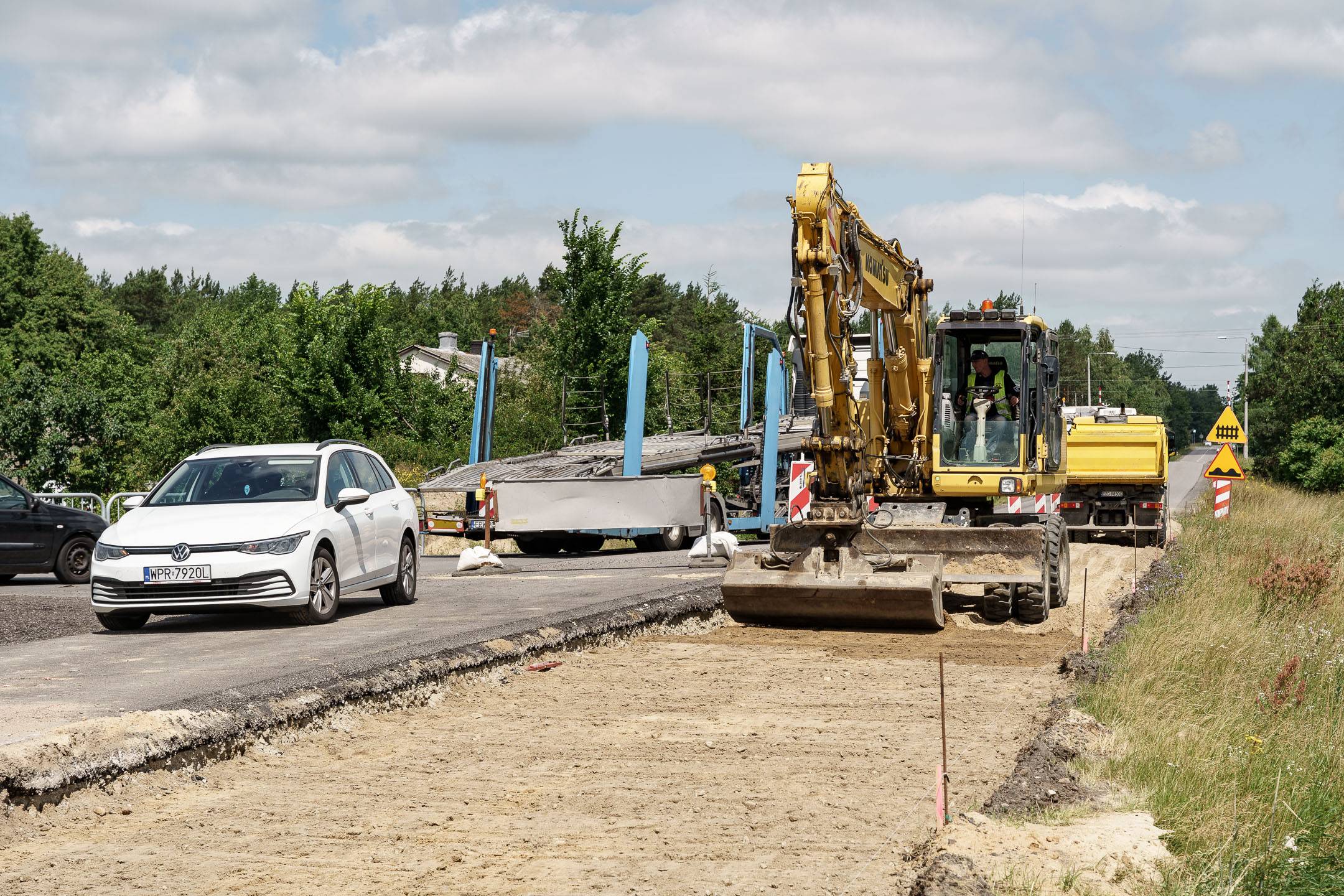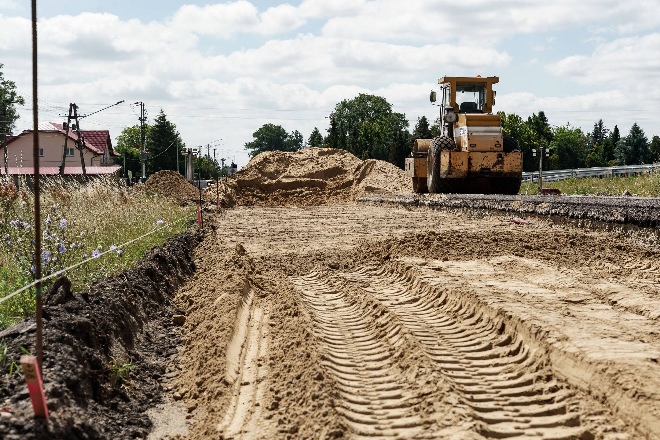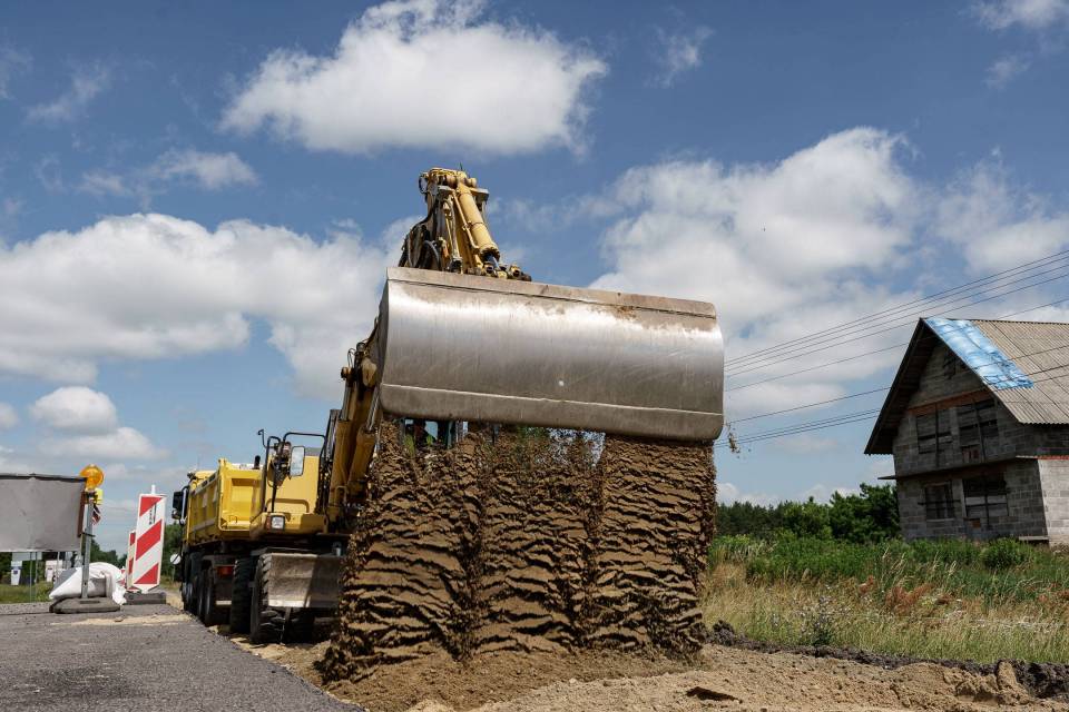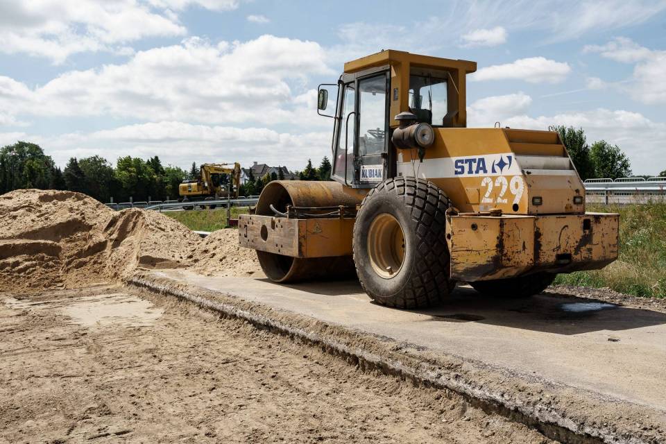 W części drogowej inwestycji prowadzone jest m.in. korytowanie pod nową konstrukcję drogi na drugiej połówce jezdni. Pierwsza połówka jest już gotowa, przed drogowcami położenie warstwy wiążącej asfaltu.