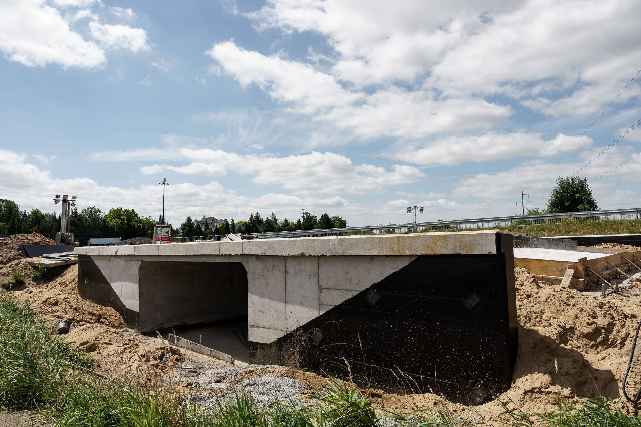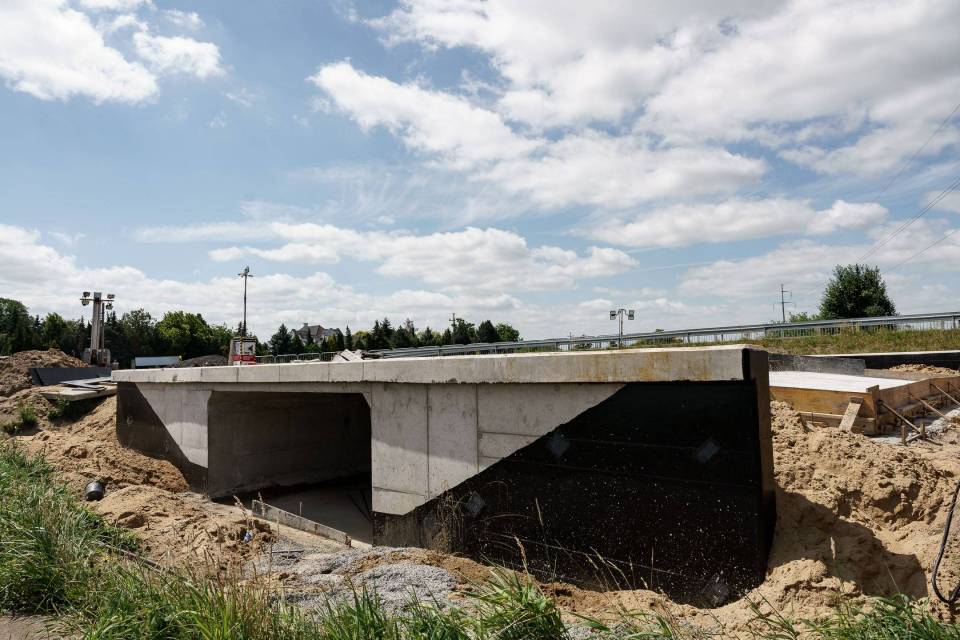 W części dot. budowy nowych przepustów trwają prace związane z zasypkami na obiektach, następnie dokończony zostanie montaż na nich: płyt przejściowych (połączenie przepustów z dojazdami) oraz kap chodnikowych.