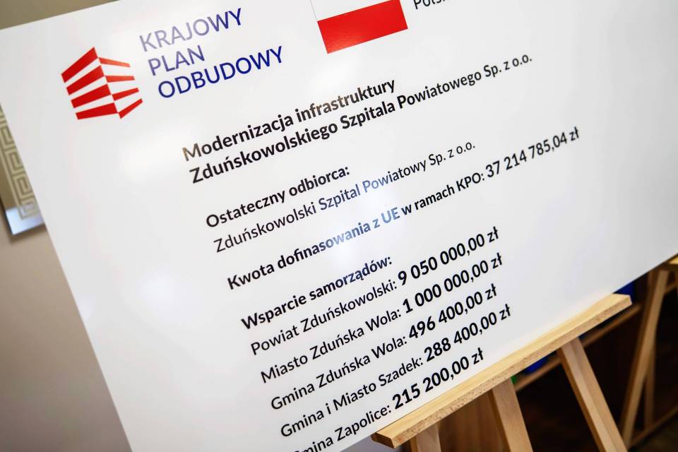 Ponad 37 mln zł dotacji dla Zduńskowolskiego Szpitala Powiatowego na rozbudowę oraz zakup sprzętu diagnostycznego. Po zakończeniu inwestycji w szpitalu w Zduńskiej Woli możliwe będzie m.in. skuteczne leczenie chirurgiczne pacjentów z chorobami onkologicznymi. Dotacja pochodzi z unijnych funduszy Krajowego Planu Odbudowy i Zwiększania Odporności.