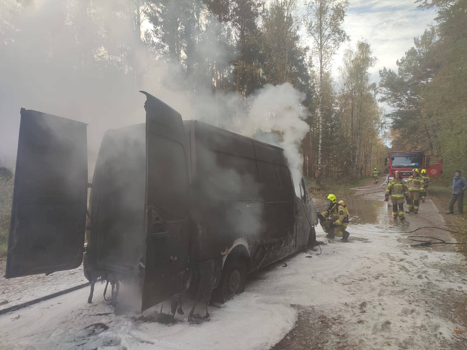 Zgłoszenie o pożarze Renault Master wpłynęło do służb ratunkowych o godzinie 8.14. Na miejsce łącznie zadysponowano trzy zastępy w sile dwunastu strażaków. Do akcji ruszyły wozy z Jednostki Ratowniczo-Gaśniczej w Łasku oraz Ochotniczej Straży Pożarnej w Marzeninie.