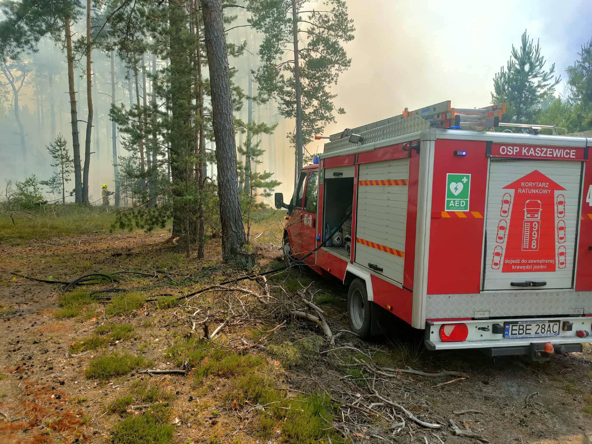 Na miejscu pracowało łącznie 10 zastępów straży pożarnej, w tym jednostki OSP z Kaszewic, Kluk (dwa zastępy), Kamienia, Grocholic, Łękawy oraz Bełchatowa. Do działań włączyła się również Jednostka Ratowniczo-Gaśnicza z Bełchatowa, dysponująca dwoma pojazdami. W trudnych warunkach, przy dużym zadymieniu i wysokich temperaturach, pomoc z powietrza zapewnił samolot gaśniczy udostępniony przez Nadleśnictwo.