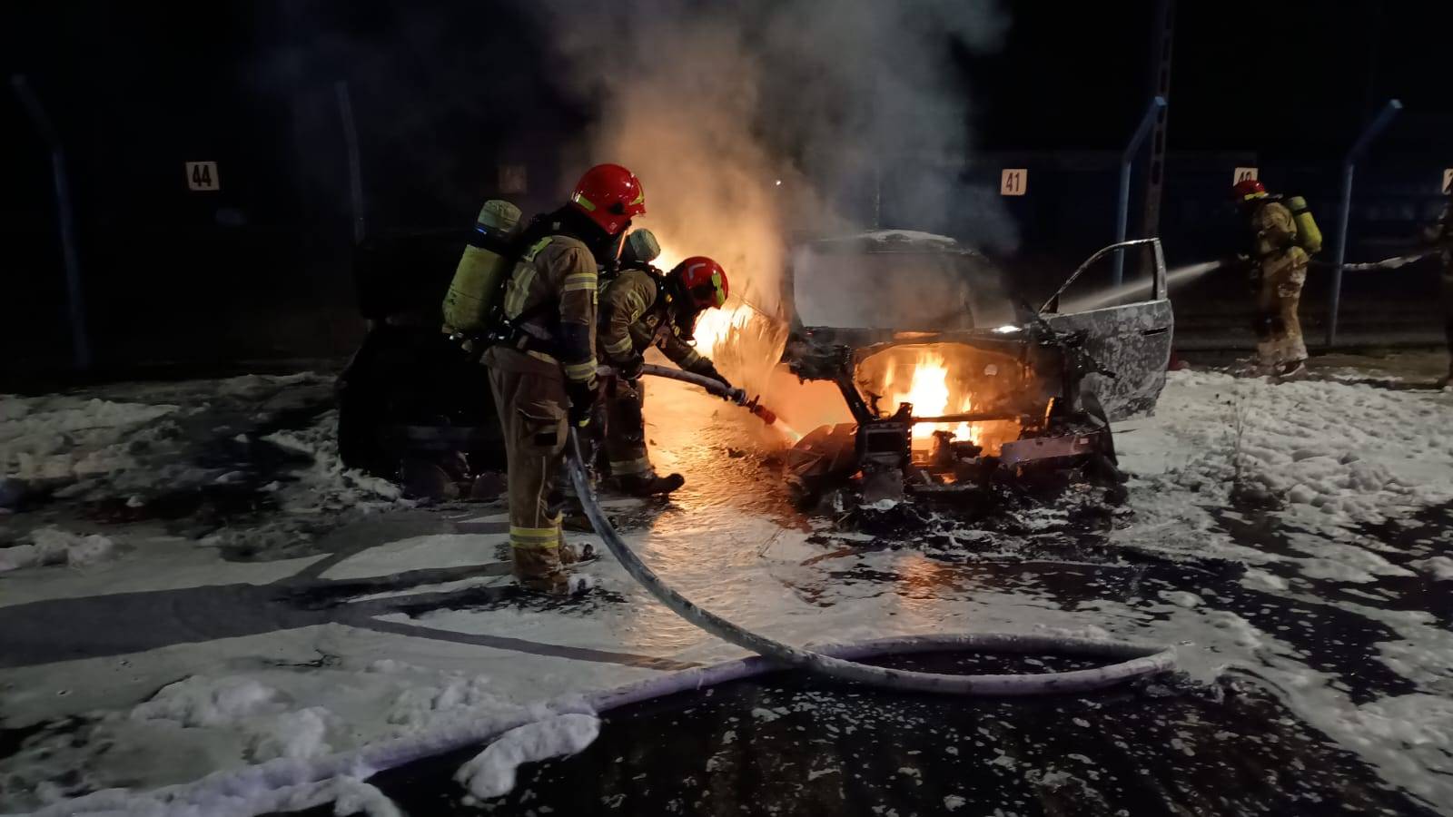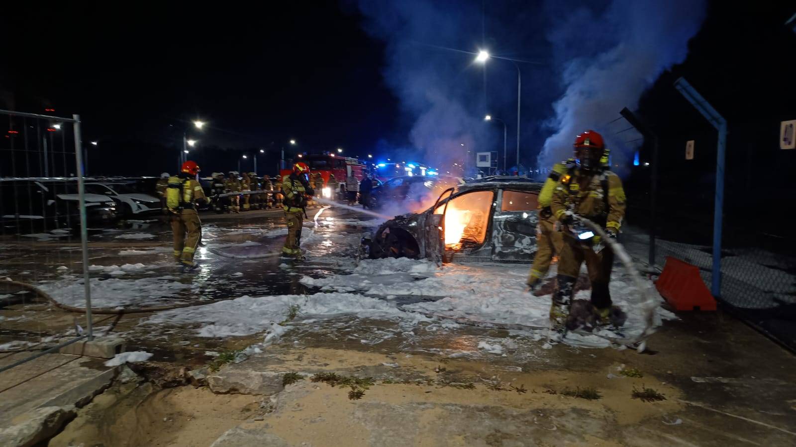 Po dotarciu pierwszych zastępów na miejsce zdarzenia potwierdzono rozwinięty pożar dwóch pojazdów - samochodu spalinowego marki Hyundai i20 oraz elektrycznego Hyundaia Ioniq. Ogień objął całkowicie obie maszyny.
